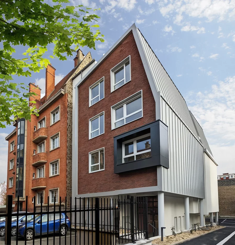 L’association Aurore construit et gère des lieux de vie pour des personnes n’ayant pas accès au logement de droit commun. La qualité de cet ouvrage est à la mesure des besoins et de la fragilité des personnes qui y vivent. C’est un habitat temporaire qui doit assurer la sérénité de ses occupants. De part la configuration de la parcelle, de la morphologie des constructions avoisinantes et des différentes règles d’urbanisme. Les murs pignons sont traités avec beaucoup d’attention afin d’offrir un élément animé dans le paysage du quartier. Le projet a été imaginé comme deux pavillons reliés par une galerie. Un pavillon sur rue et un second sur jardin. Ce qui permet de créer un grand espace végétalisé à l’arrière de la parcelle.