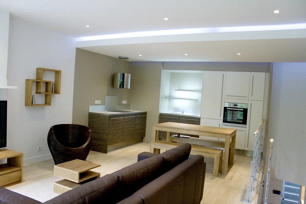 Une grande harmonie a été recherchée pour mettre en valeur cet appartement parisien. Un ton sobre par des matériaux naturel a abouti à transformer radicalement l’espace grâce à des forme géométriques contemporaines et épurées. L’homogénéité de traitement en terme de tons et de textures rend la transition d’un espace à l’autre fluide et confortable.