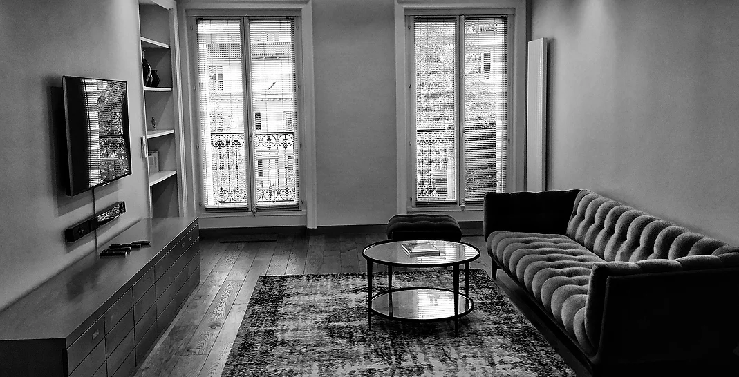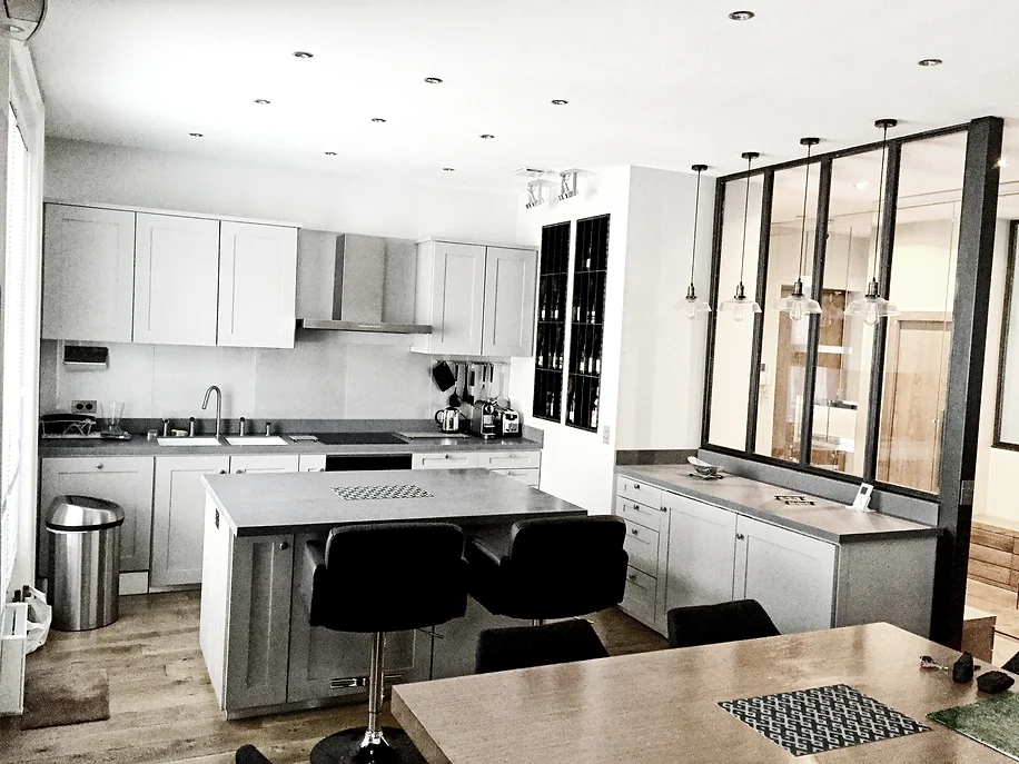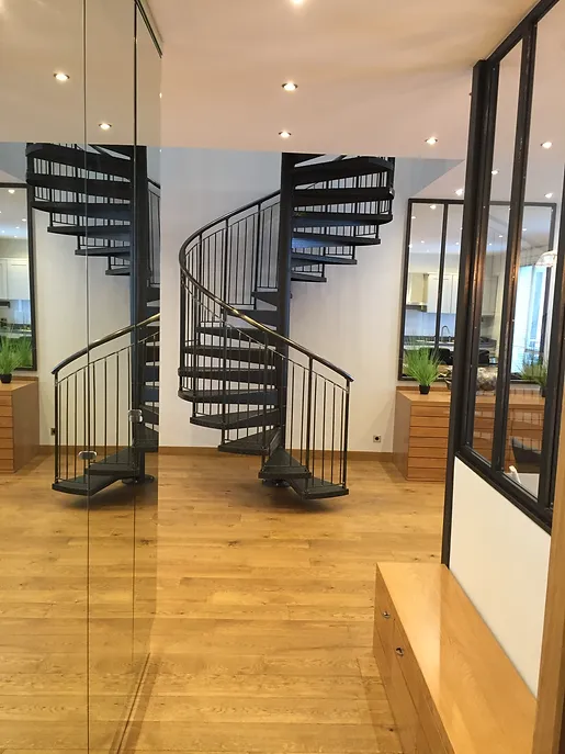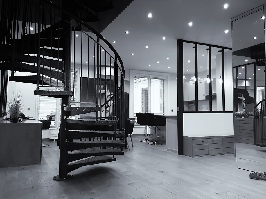 L’architecture d’intérieur a pour objectif ici de combiner des univers très variés au sein d’un même espace de vie. Le client avait un goût prononcé pour le style industriel, ce qui nous a inspiré et conduit a cadrer les différents espaces de vie par des serrureries et menuiseries en métal noire.