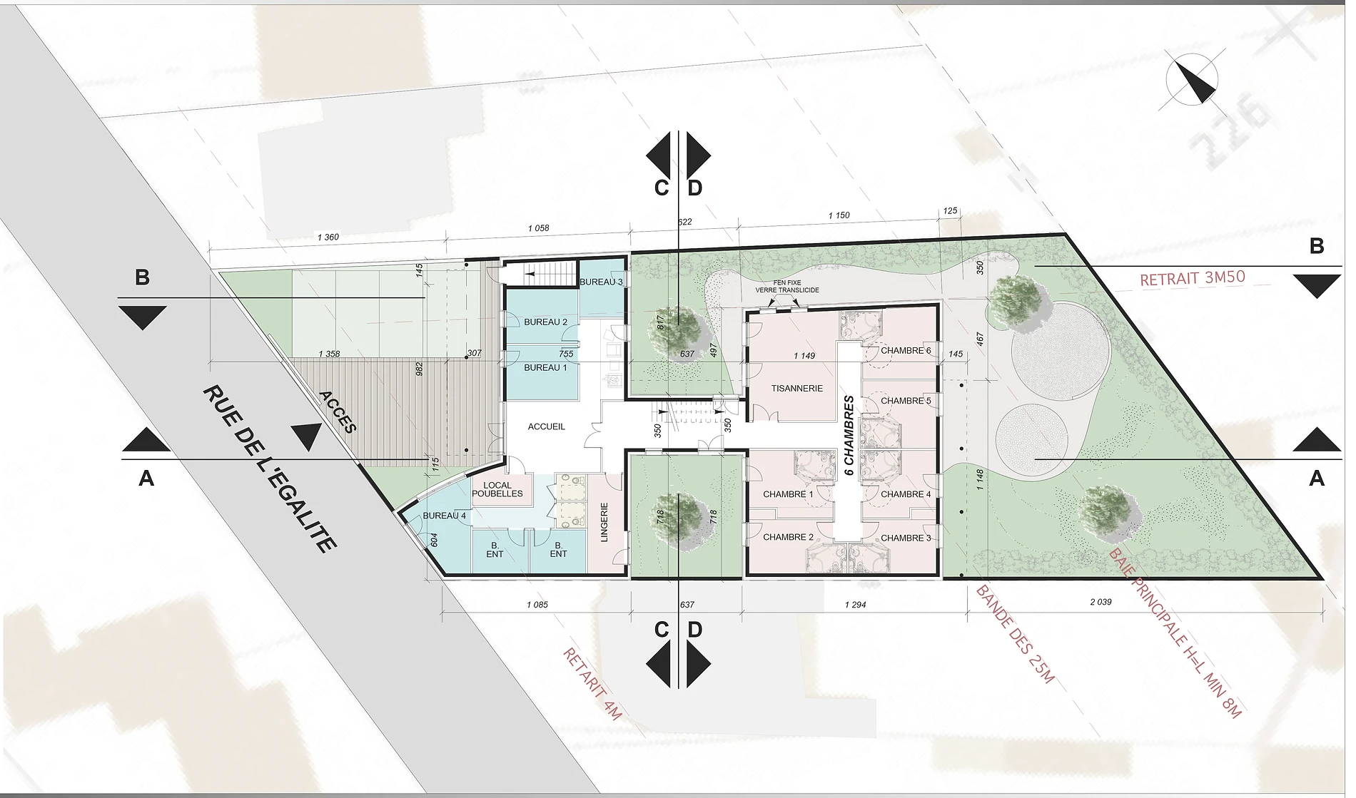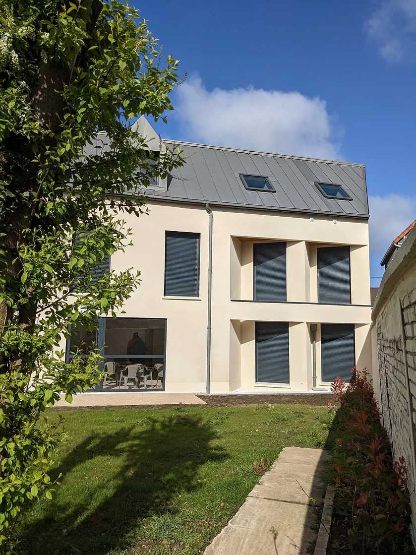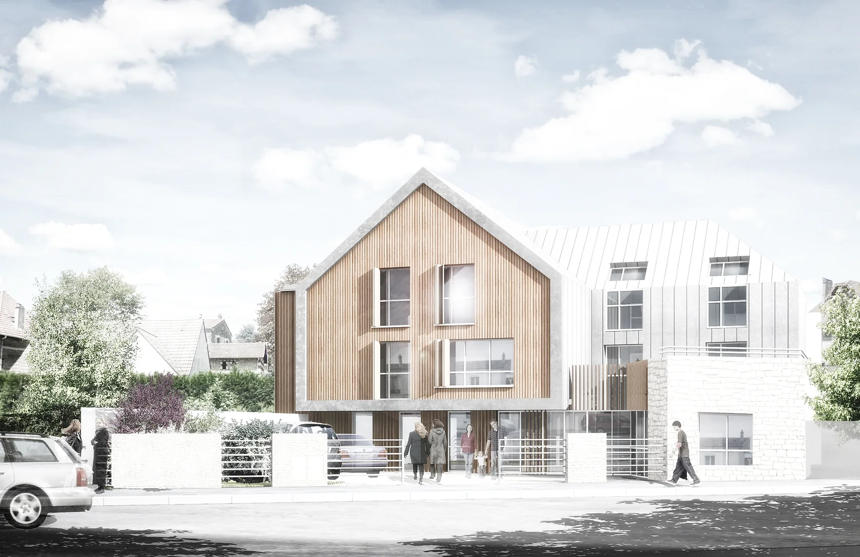 La qualité de cet ouvrage est à la mesure des besoins et de la fragilité des personnes qui y vivent. C’est un habitat temporaire qui doit assurer la sérénité de ses occupants. De part la configuration de la parcelle, de la morphologie des constructions avoisinantes et des différentes règles d’urbanisme. Les murs pignons sont traités avec beaucoup d’attention afin d’offrir un élément animé dans le paysage du quartier.