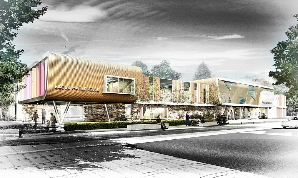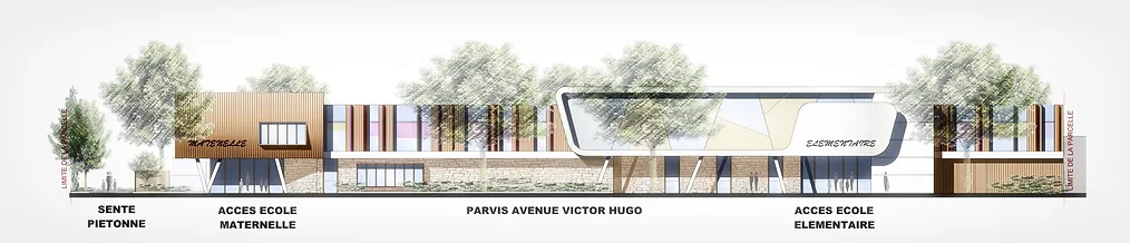 L’axe sur lequel s’implante le projet est imaginé comme une colonne vertébrale. C’est un axe paysager structurant. La transition entre les espaces publics et l’équipement scolaire sont développés à travers la création d’un parvis.