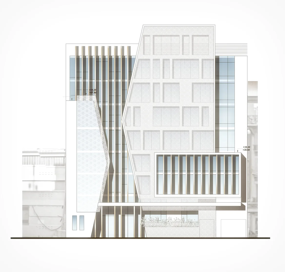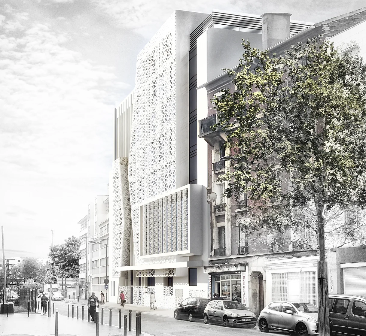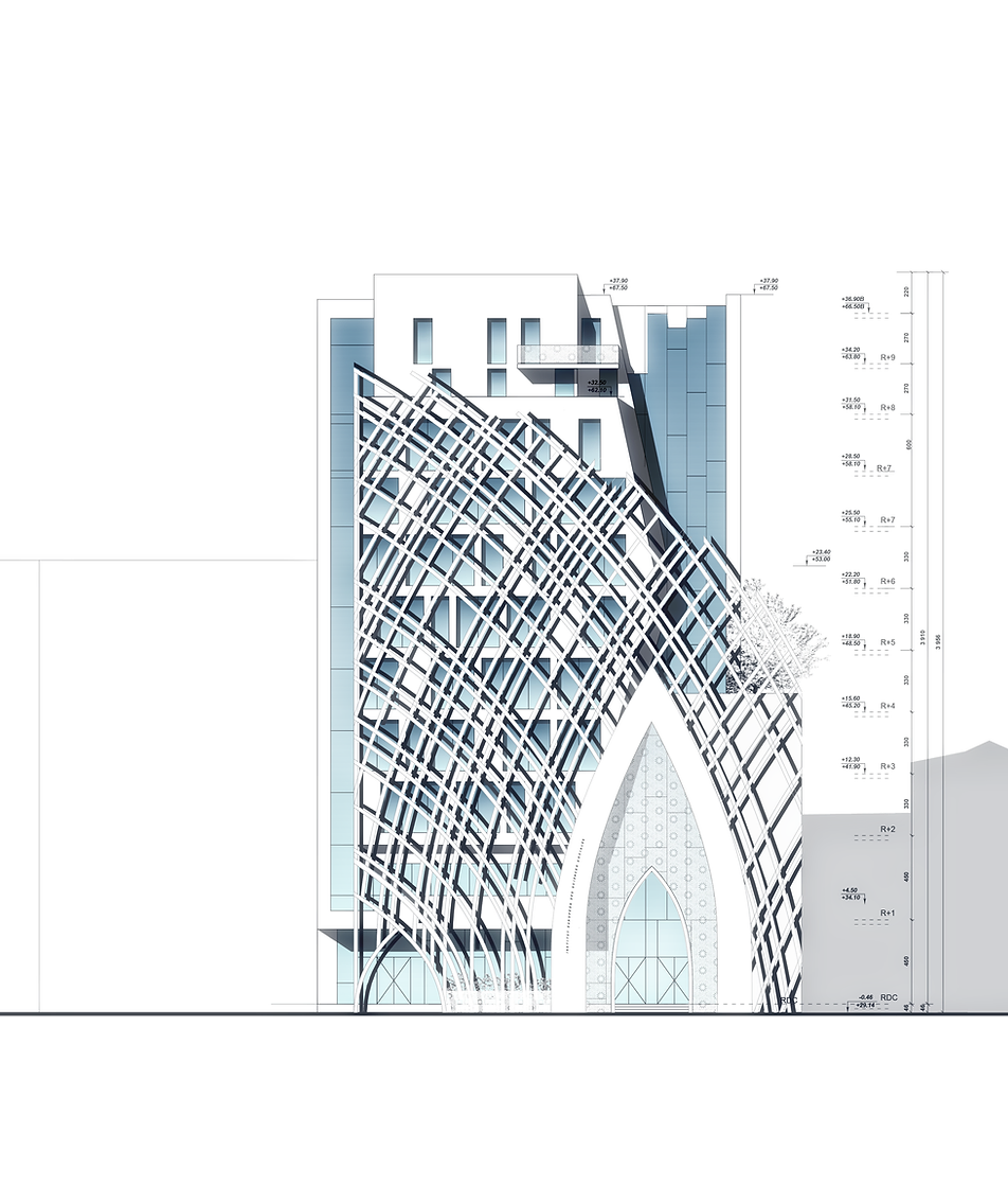 L’habillage de façade en résille métallique, réinterprétant l’arc d’ogive, agit également comme un brise-soleil : les excès de lumière sont atténués, réduisant l’effet de serre en faveur des économies d’énergie.