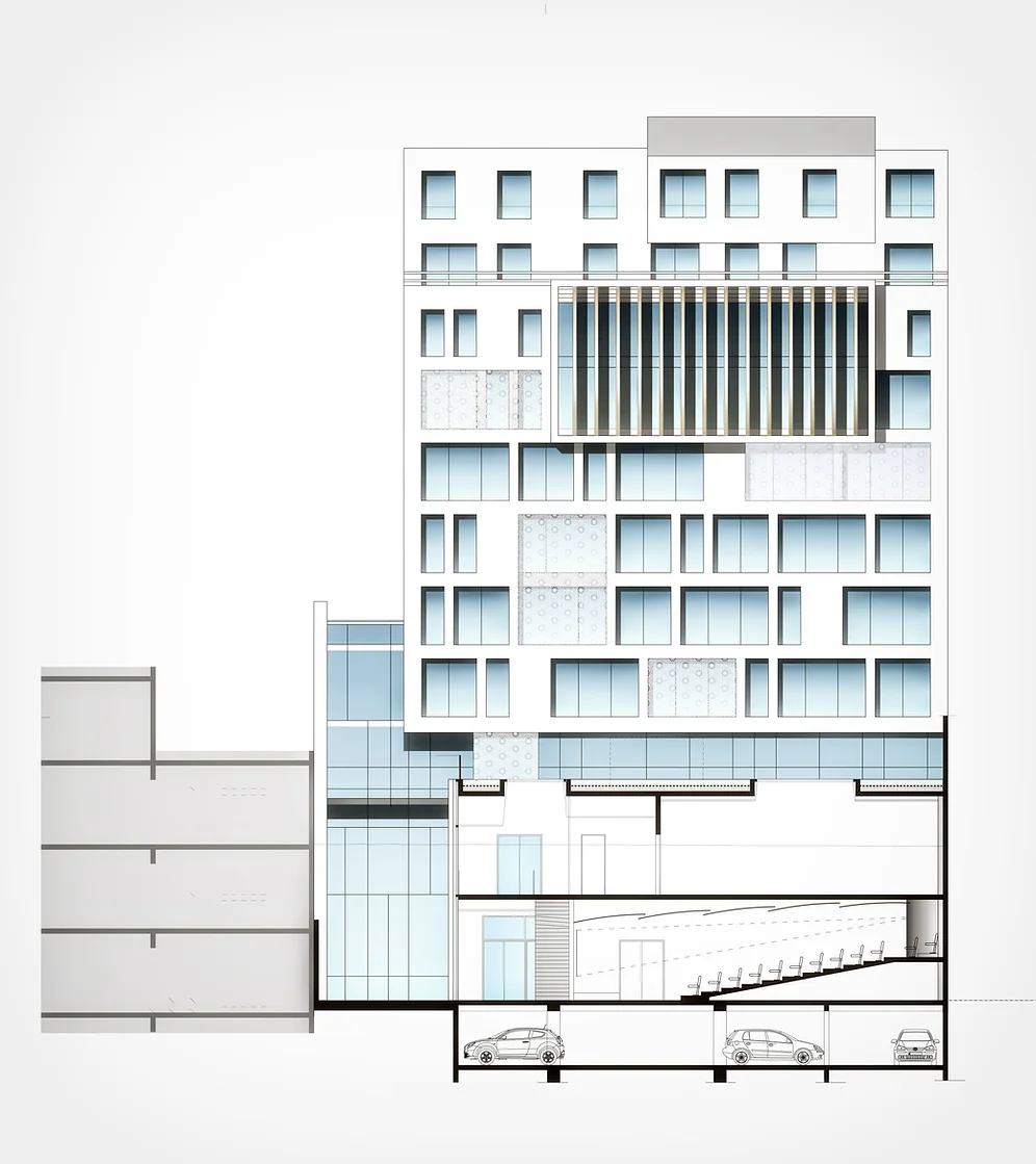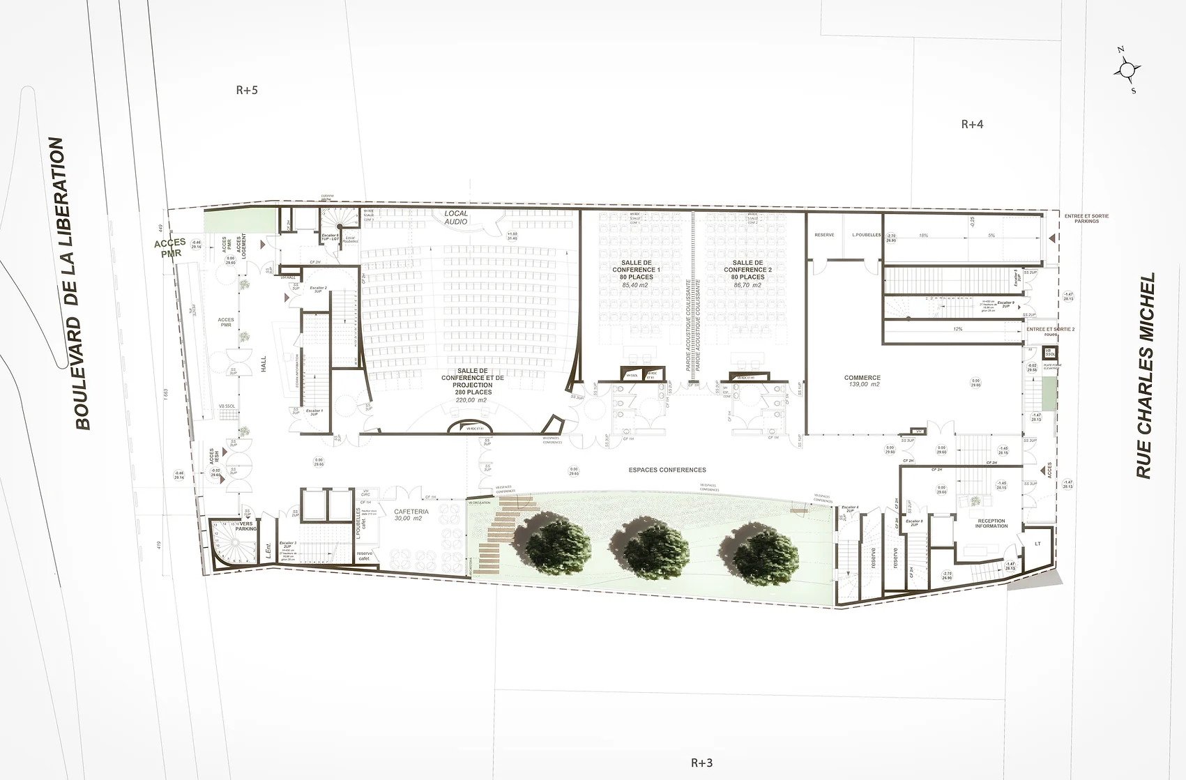Ce projet traversant, entre le boulevard de la Libération et la rue Charles Michel, met l’accent sur l’esprit de quartier, assurant une transition de l’espace public vers l’espace privé par des interfaces progressives, et particulièrement une grande rue intérieure sur les deux premiers niveaux du bâtiment. Ce projet mêle architecture des bâtiments et architecture des jardins, à travers trois grandes références: