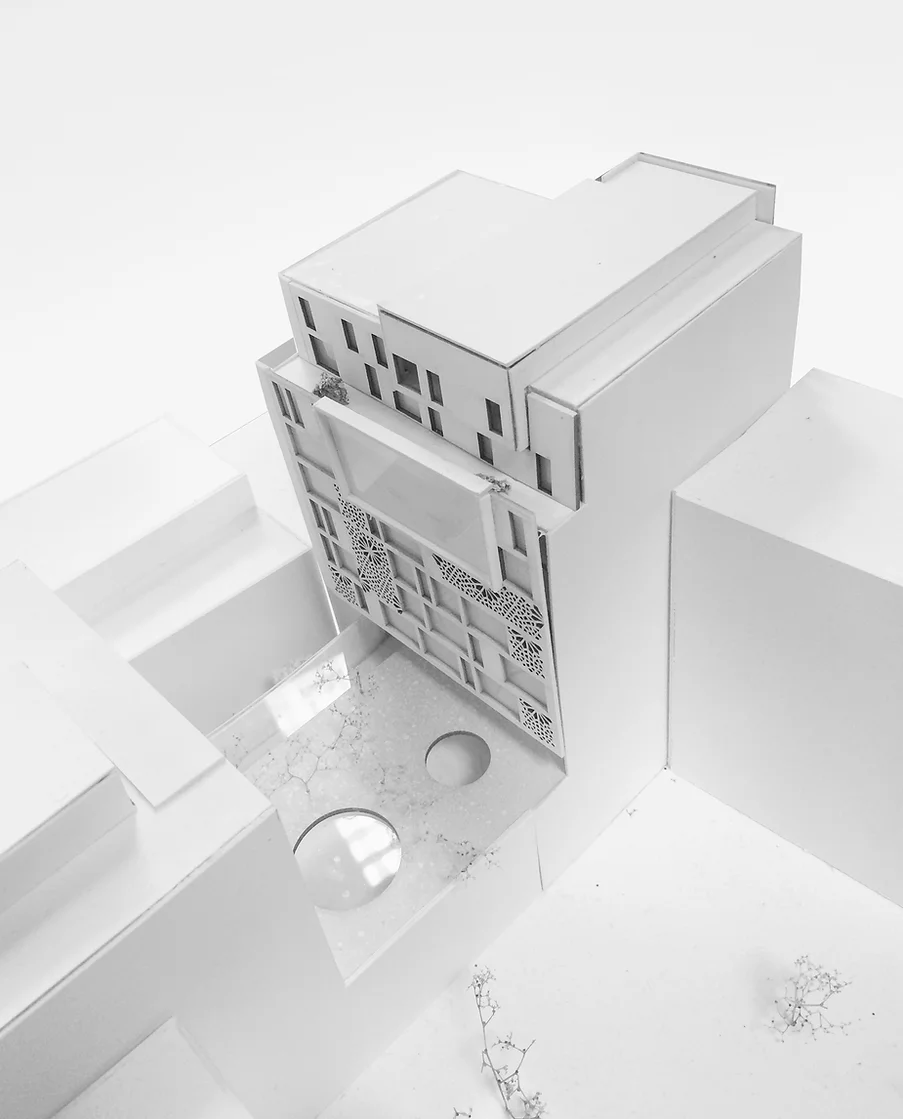 • Le moucharabieh : les façades sont parées d’un habit blanc et sobre dont le motif de moucharabieh rappelle la culture enseignée à l’Institut.