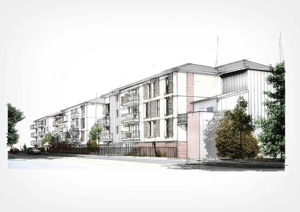 Les proportions du bâtiment respectent l’échelle de son quartier. Il en vas de même pour la matérialité de l’ouvrage, une toiture en zinc sera déployée sur l’ensemble des constructions de ce quartier en devenir. Un séquencement de la volumétrie permet d’affirmer l’urbanité de l’ensemble.