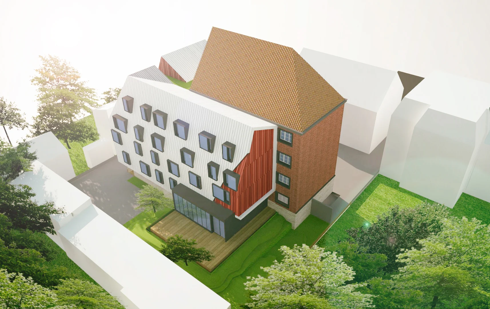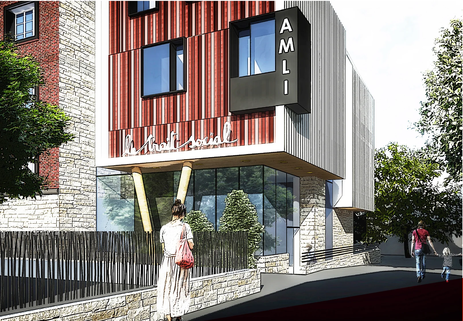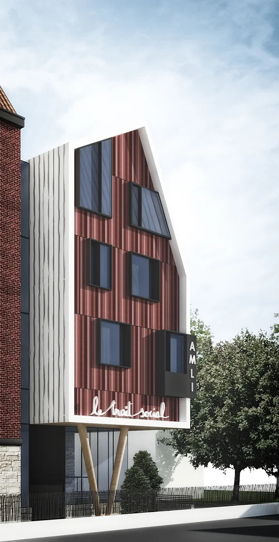L’équipe de KARAKTER s’est penché sur la méthode de réflexion. Celle-ci a permis de développer une connaissance sur les besoins des femmes en rupture d’hébergement. L’approfondissement de ce savoir est allé de paire avec une réflexion spatiale et urbaine qui valorise le bâtiment sur le site. Ainsi, le parti-pris du projet consiste à créer une gradation de la sphère publique vers la sphère privée. Ce qui commence au seuil du bâtiment, les niveaux de sols sont travaillés de manière à concevoir en coupe une séparation physique entre public et privé pour le bien-être psychique des résidentes, les accès à la parcelle ont été contrôlés selon cet objectif.