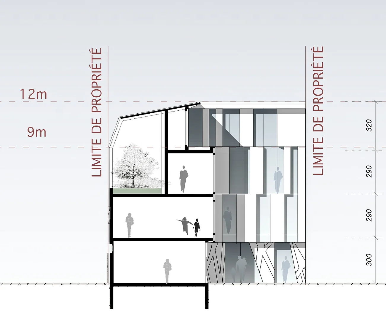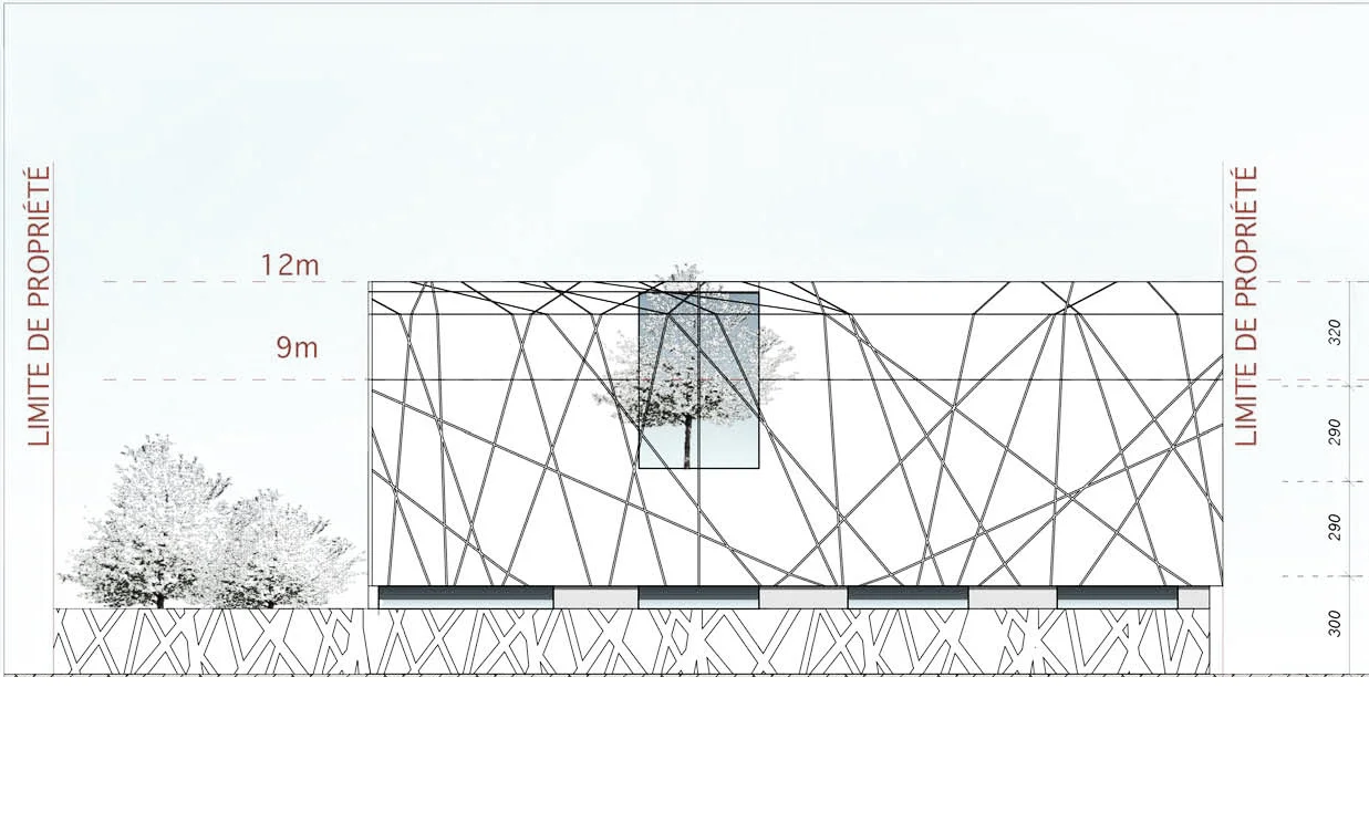 Un espace jardin minéral sur la rue et un jardin d’agrément sur l’arrière. Le bâtiment s’appuie sur a limite de propriété coté ensemble immobilier en R+10. Afin de libérer un maximum de surface et de volume du coté des pavillons. Le bâtiment transversal permet de créer un grand jardin abrité à l’arrière de la parcelle. Les murs pignon, et particulièrement la façade sur l’ensemble résidentiel, seront traités avec beaucoup d’attention afin d’offrir un élément animé dans le paysage du quartier.