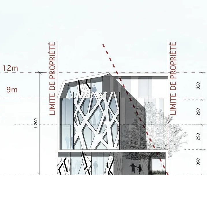De part la configuration de la parcelle, la morphologie des constructions avoisinantes et les différentes règles d’urbanisme, le projet a été imaginé en 2 volumes différents et complémentaires. L’un prend appuis sur le mitoyen et l’autre s’y imbrique transversalement, ce qui permettra de créer 2 espaces jardin.