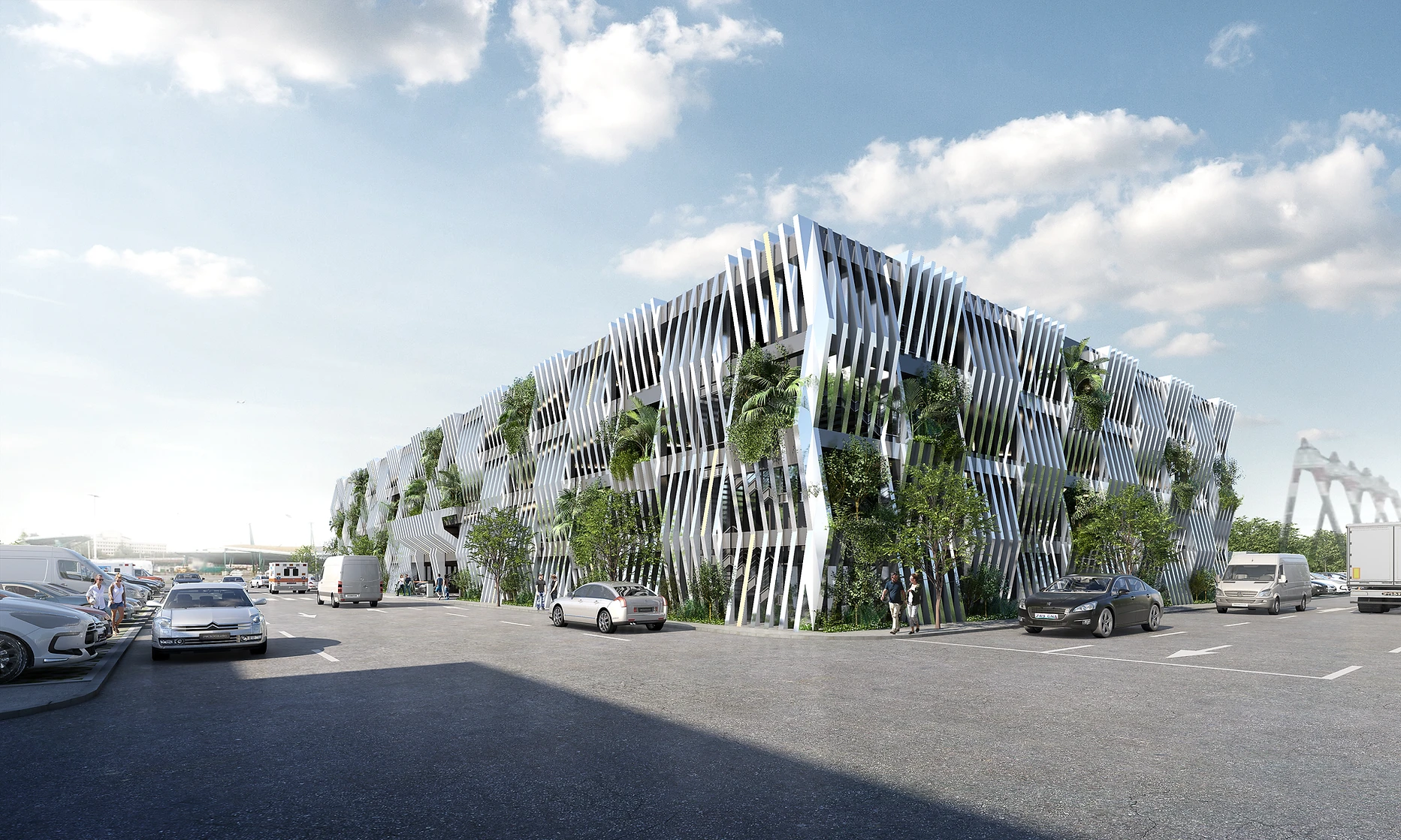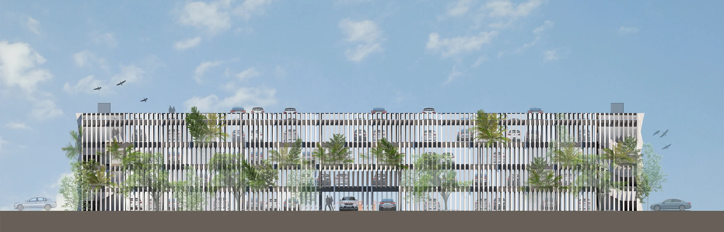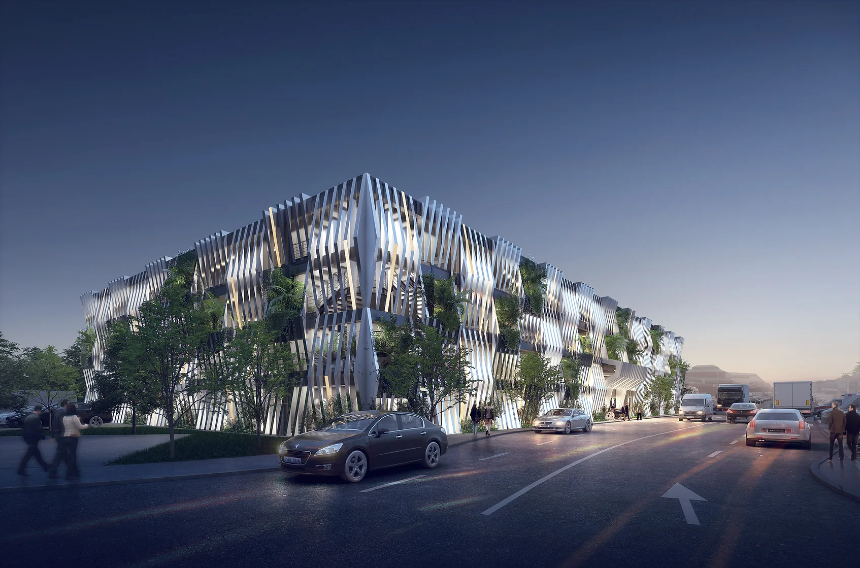 Nous avons imaginé notre édifice comme une symbolisation de plantes grimpantes habillants la structure du parking silo, matérialisée par une maille verticale métallique, qui se déploie vers le ciel et dévoile des interstices laissant respirer l’ensemble, faisant naître ponctuellement des massifs végétalisés afin de compenser les d’échappement. La perméabilité rejets de gaz et l’ouverture à l’air libre de cet ensemble structurel permet également de réduire considérablement les contraintes de tenu au feu de la charpente métallique porteuse et simplifier les réseaux de ventilation, allant dans le sens de la maîtrise du coût de cette réalisation.