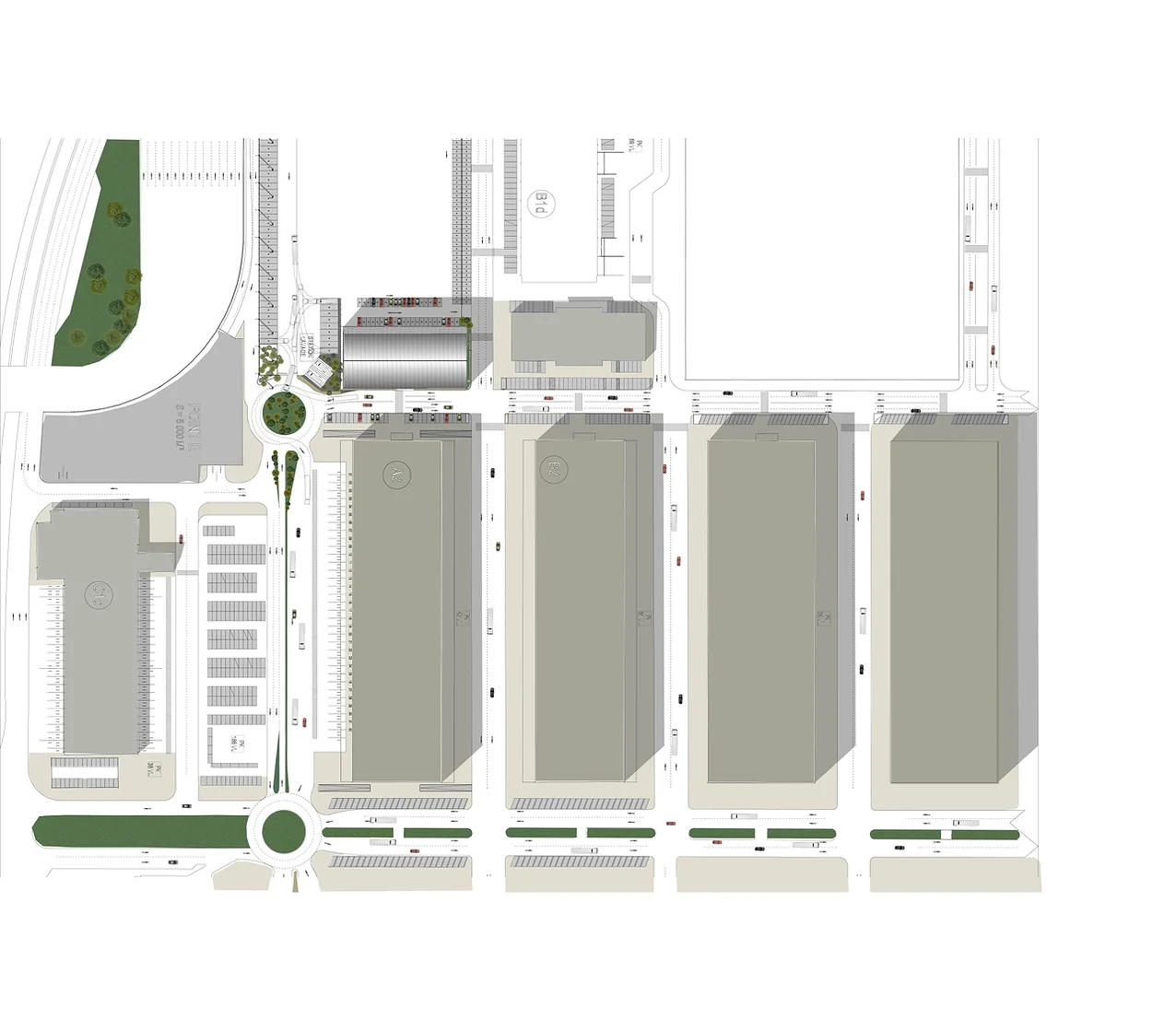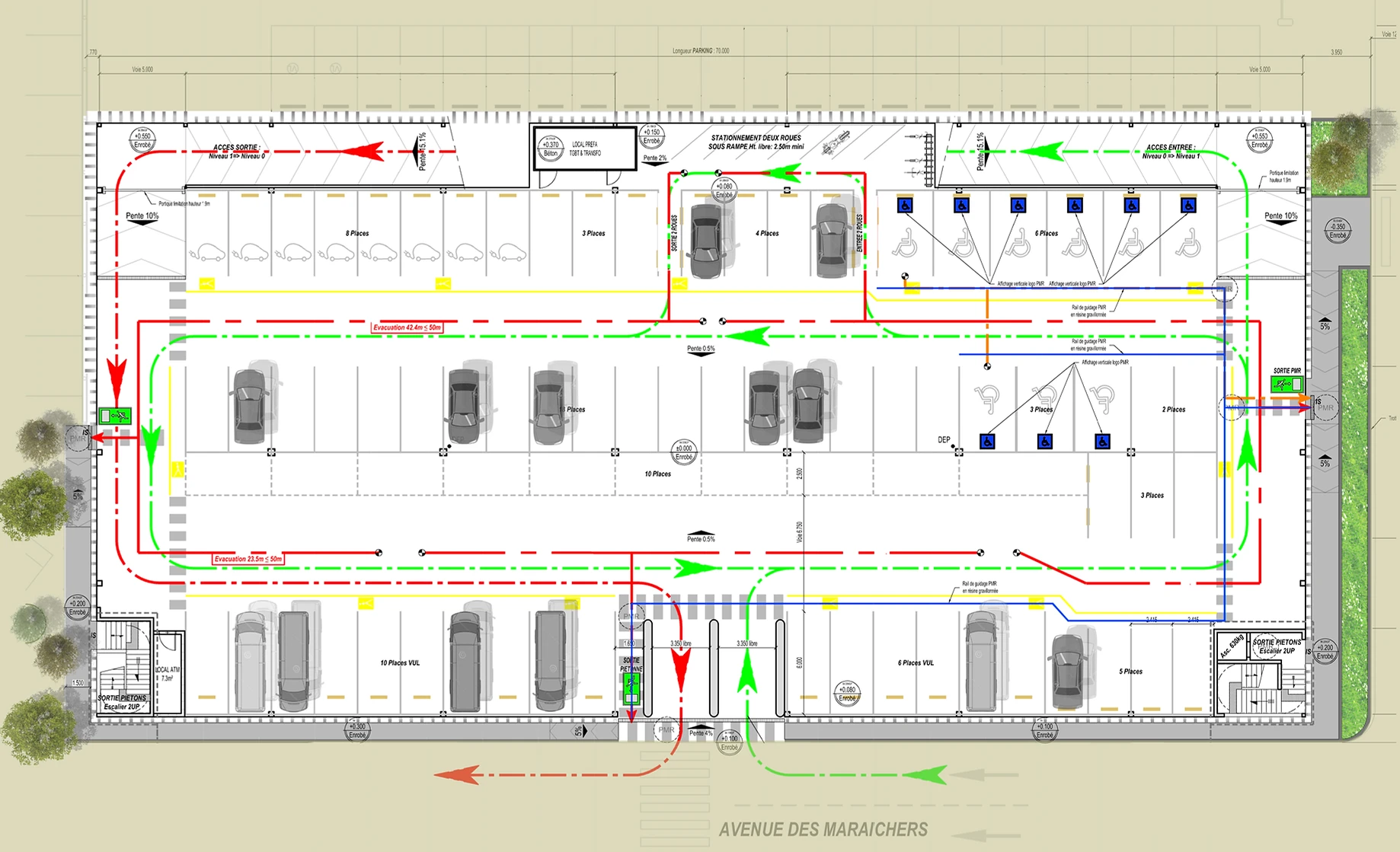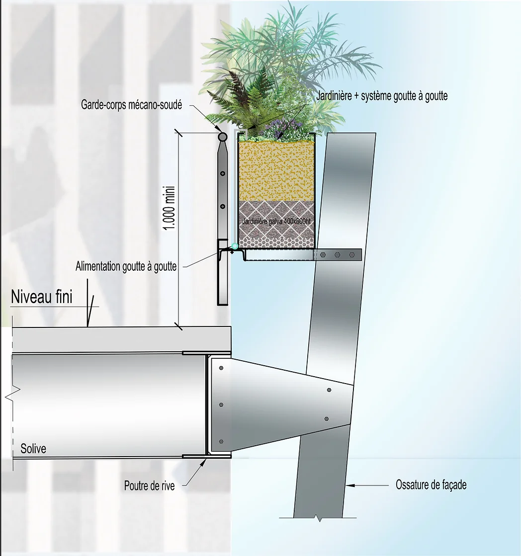 Nous avons imaginé notre édifice comme une symbolisation de plantes grimpantes habillants la structure du parking silo, matérialisée par une maille verticale métallique, qui se déploie vers le ciel et dévoile des interstices laissant respirer l’ensemble, faisant naître ponctuellement des massifs végétalisés afin de compenser les d’échappement. La perméabilité rejets de gaz et l’ouverture à l’air libre de cet ensemble structurel permet également de réduire considérablement les contraintes de tenu au feu de la charpente métallique porteuse et simplifier les réseaux de ventilation, allant dans le sens de la maîtrise du coût de cette réalisation.